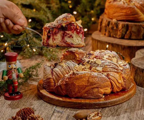 Deliciosa danesa con mermelada de frutos rojos elaborada en casa con un topping de almendra tostada y un toque de azúcar glas. (6-8 personas)